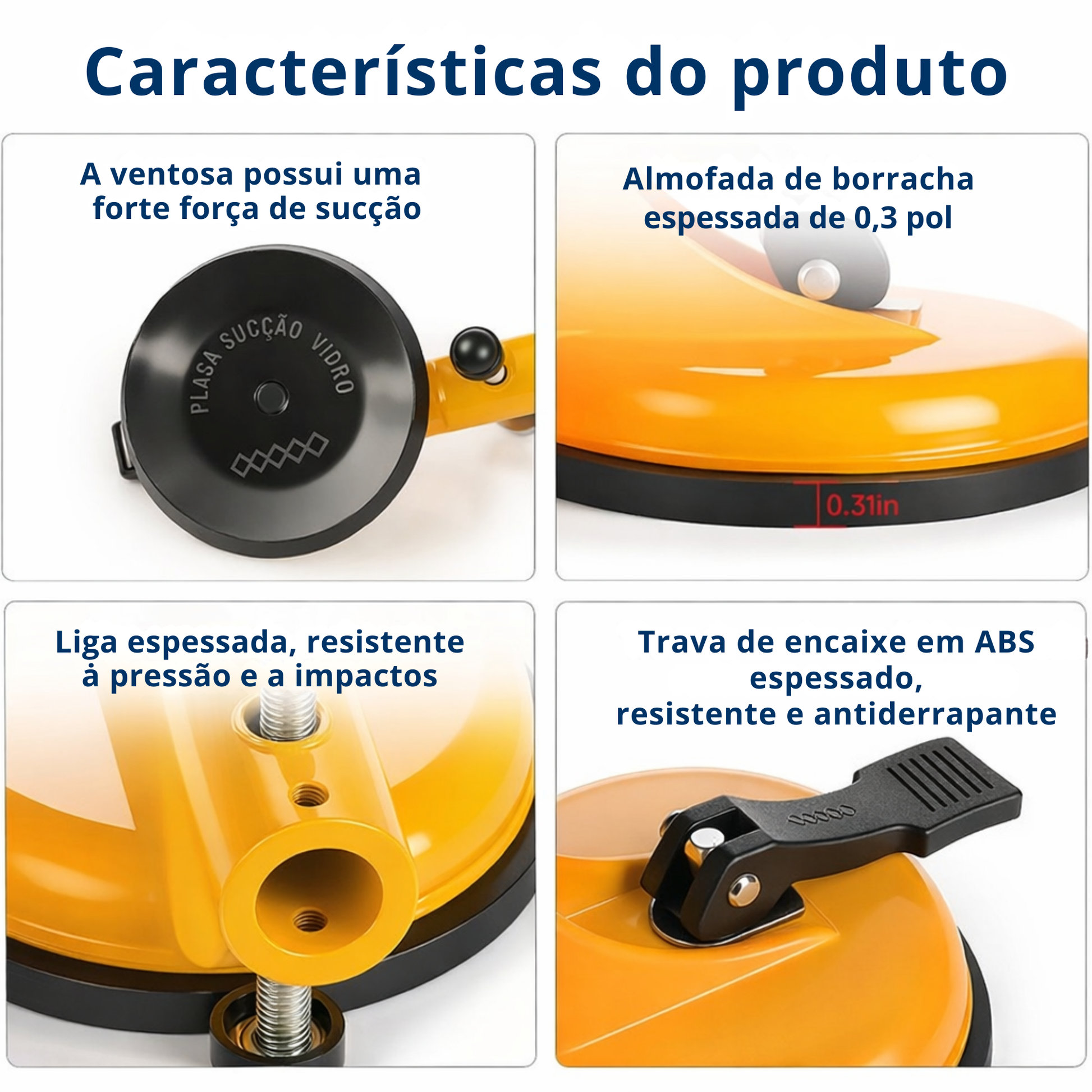 Corpo em liga espessa + haste roscada em aço + alavanca de encaixe em ABS + ventosa em borracha |