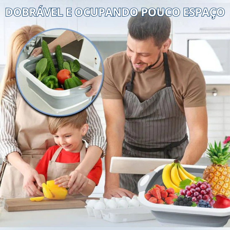 Apresentamos-lhe o Totaltool!, a nova tábua multifuncional com design dobrável que lhe permitirá poupar muito espaço na sua cozinha. Cesto, escorredor ou base para cortar alimentos, o Totaltool tem um design 3 em 1. Perfeito para cozinhas pequenas!